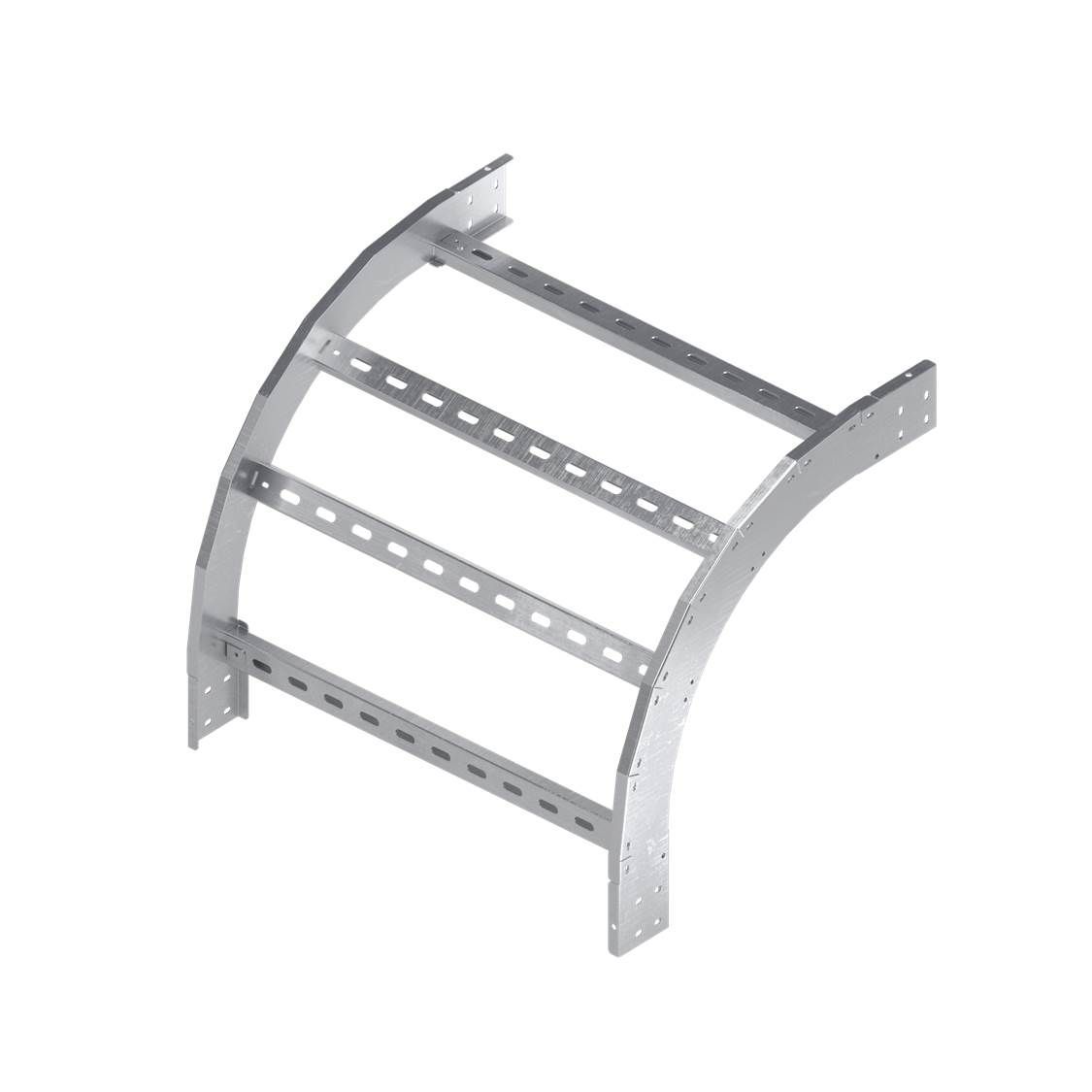Угол вертикальный внешний предназначен для организации поворота трассы на основе лестничных лотков с высотой борта 50 мм и шириной основания 400 мм вниз на 90 градусов. Радиус поворота угла - 300 мм. Аксессуар поставляется в комплекте с крепежными элементами и соединительными пластинами, необходимыми для монтажа. Данное изделие представлено в исполнении "Сталь, оцинкованная по методу Сендзимира".