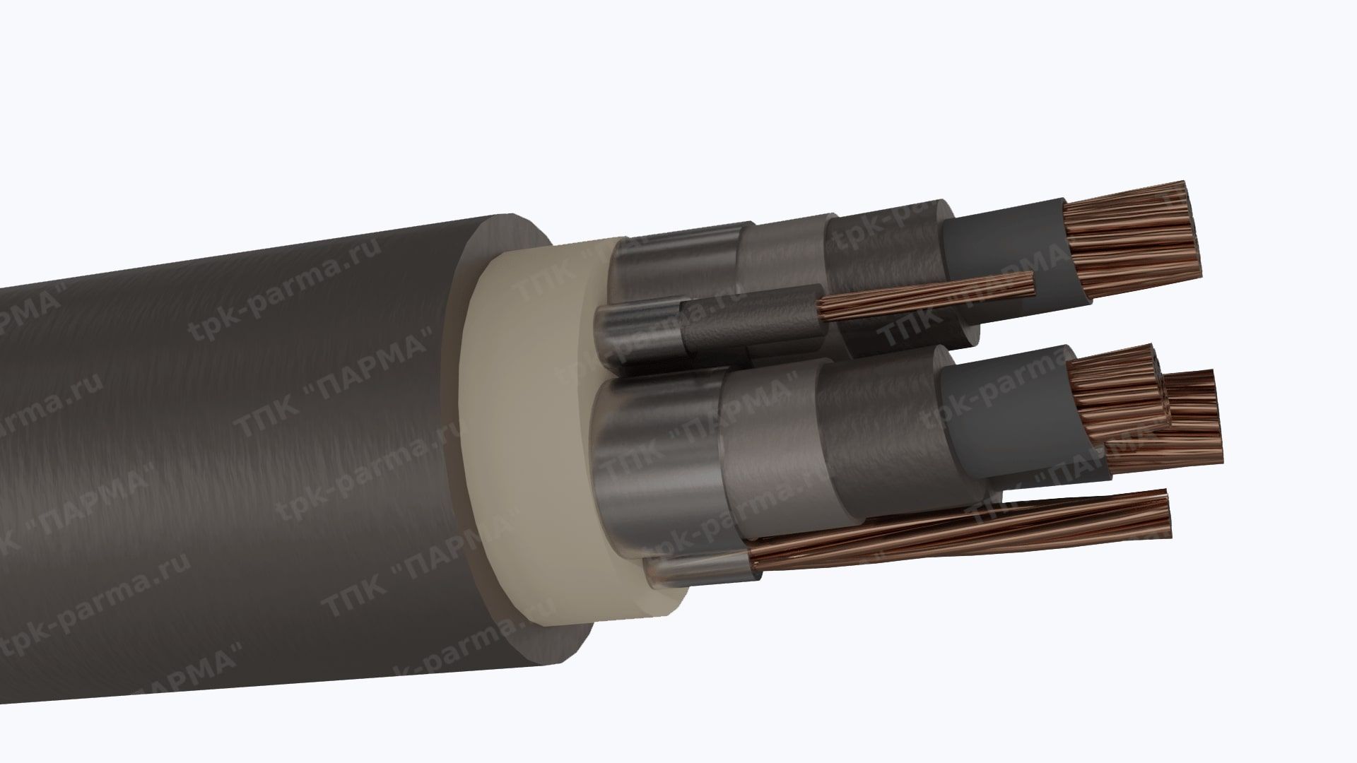 1. Три многопроволочные медные круглые основные жилы с площадью номинального поперечного сечения 95 мм2, соответствующие 5 классу по ГОСТ 22483-2012.